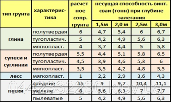 Для будинків з дерева або піноблоку (якщо вага будови невелика) застосовують палі діаметром 108 мм, для важчих будов ― палі діаметром 133 мм Діаметр гвинтової лопаті в 1,25 разів більше. Здатність, що несе, складає в середньому 6,5 тонни (для d=108 мм) і 9,5 тонни (для d=133 мм). Ці навантаження відповідають глибині укручування в тугопластичные грунти на глибину 1,7-1,8 м. Такими грунтами можуть бути глини і суглинки.